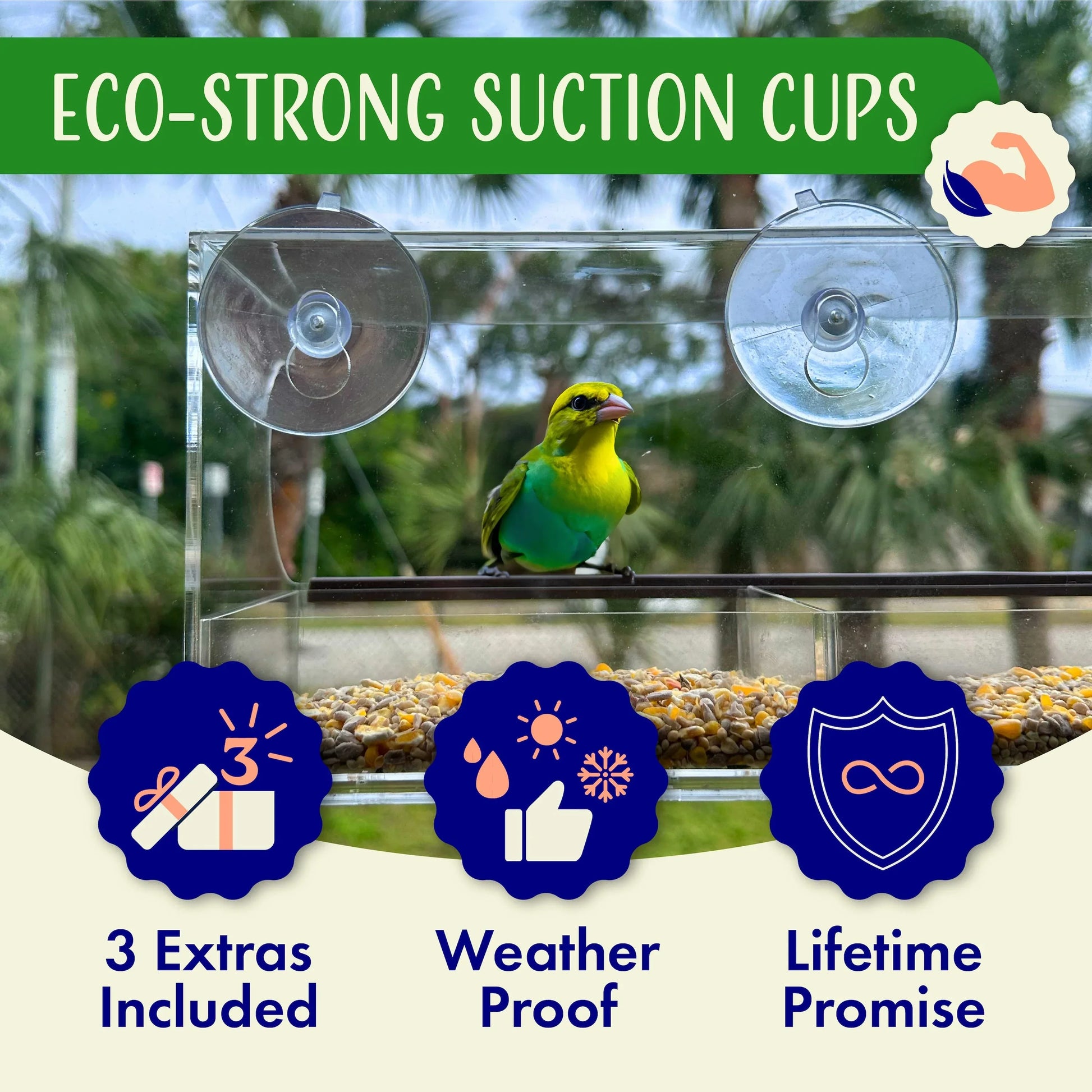 Others sit farther from your view and need frequent repairs. Front-Row uses heat-bent acrylic, industrial suction cups, and a removable seed tray to deliver lasting clarity, easy upkeep, and more flock visits.